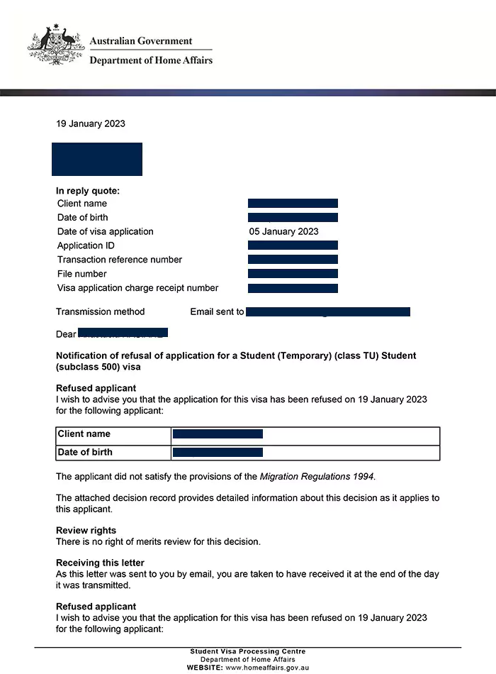 Contoh surat penolakan visa Australia
